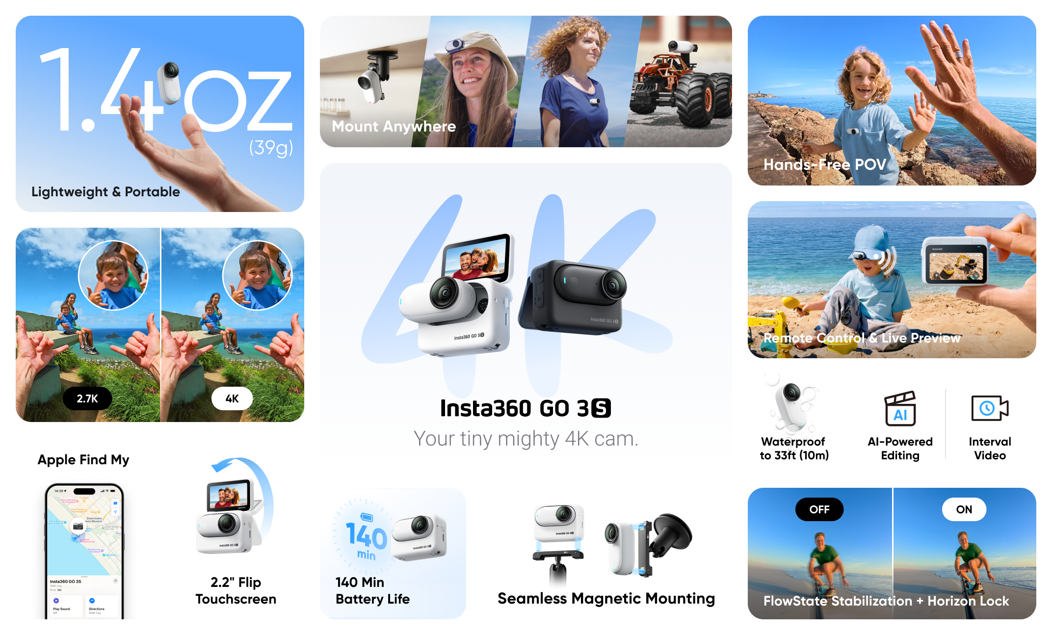 GO 3S: 38 mins GO 3S + Action Pod: 140 mins *Tested in 77°F (25°C) lab conditions at 1080p@30fps Video Mode, screen and Wi-Fi off. Run time may vary in different conditions.